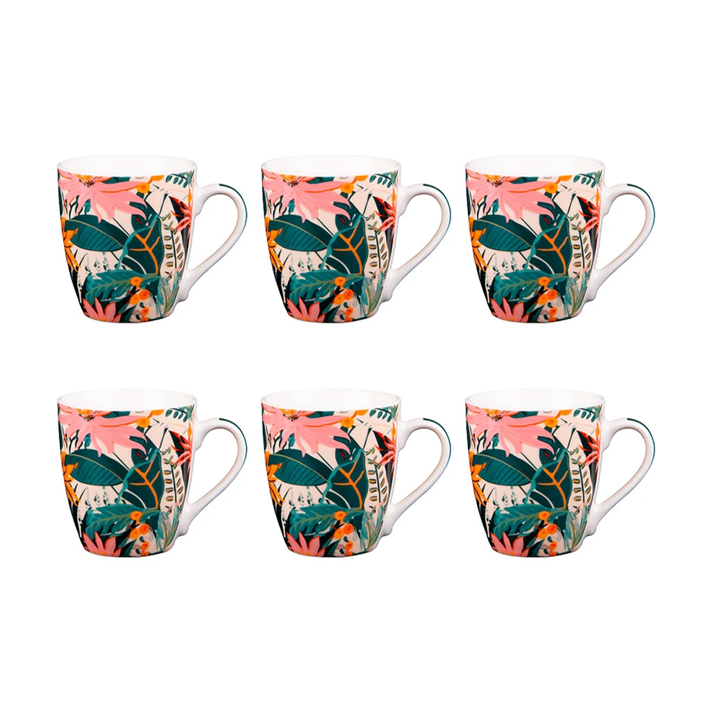 Chaque tasse est ornée d’un motif tropical vibrant, mêlant des feuillages luxuriants et des couleurs chaudes qui rappellent les paysages paradisiaques.