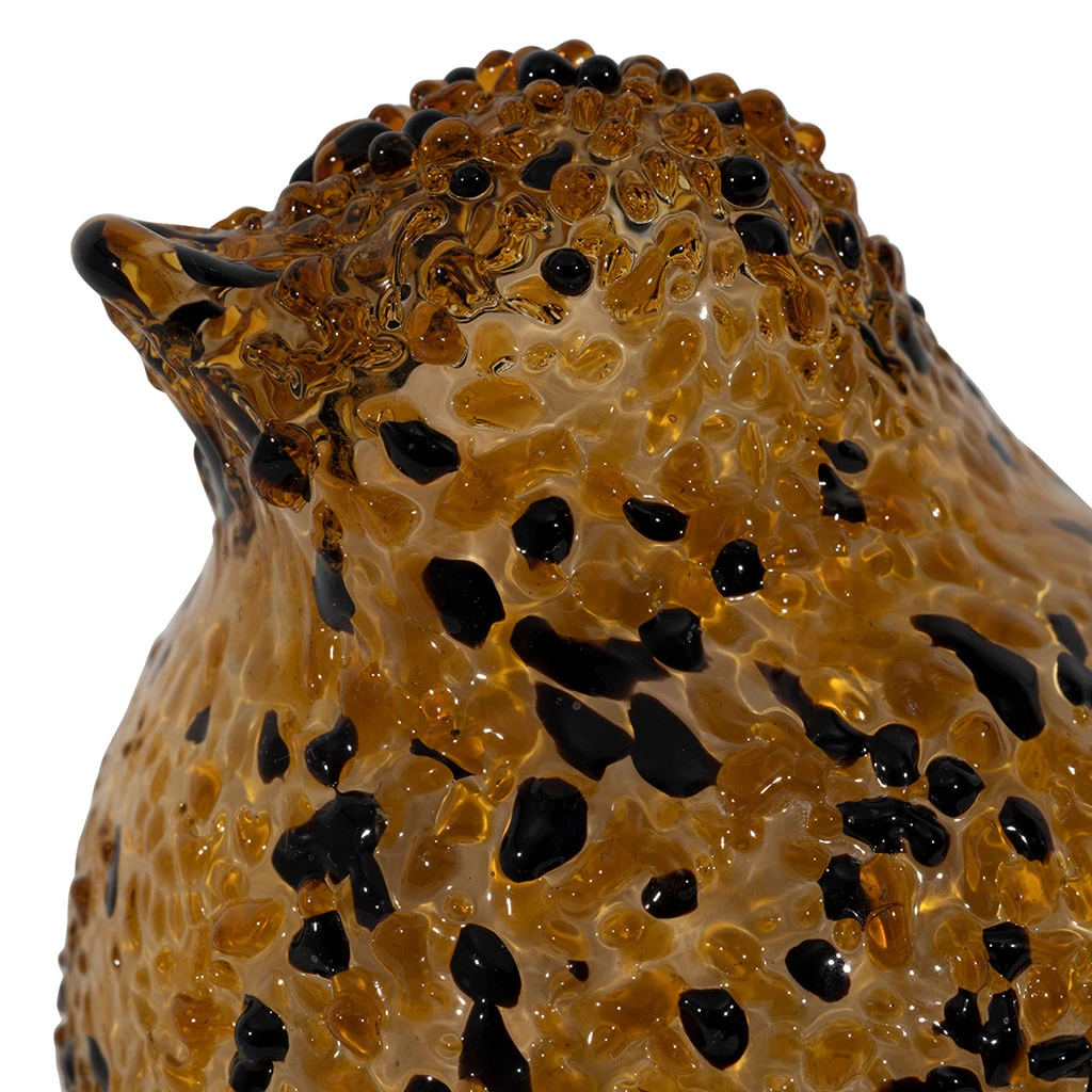 Ajoutez une touche artistique et unique à votre intérieur avec cet adorable moineau en verre aux nuances d’ambre et de noir.
