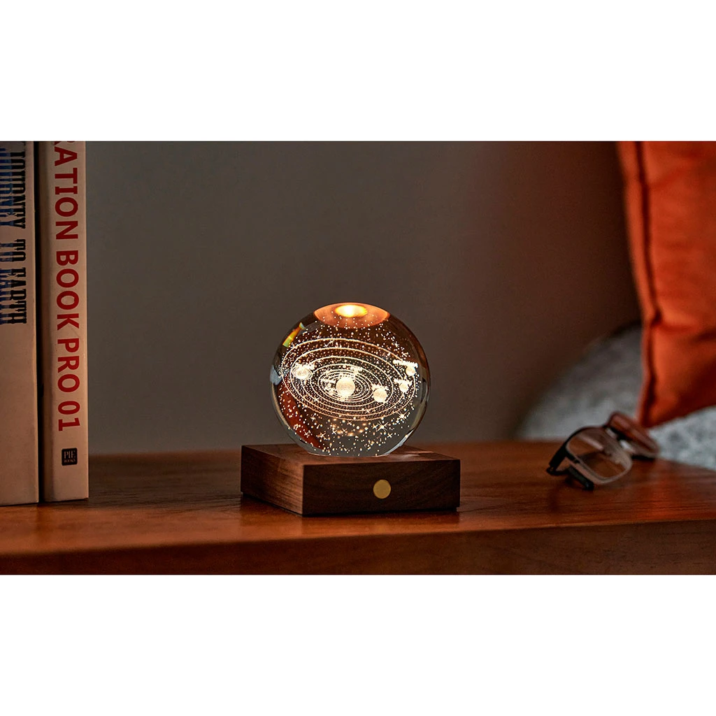 Avec une hauteur de 12 cm, la lampe boule de cristal 3D Système solaire repose sur une base en bois de noyer naturel, apportant une touche élégante à votre décoration intérieure.