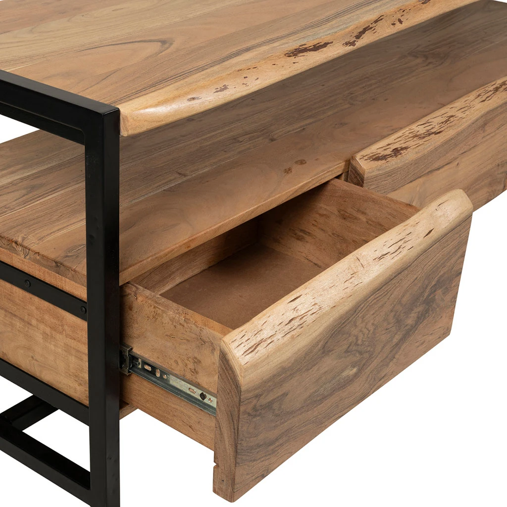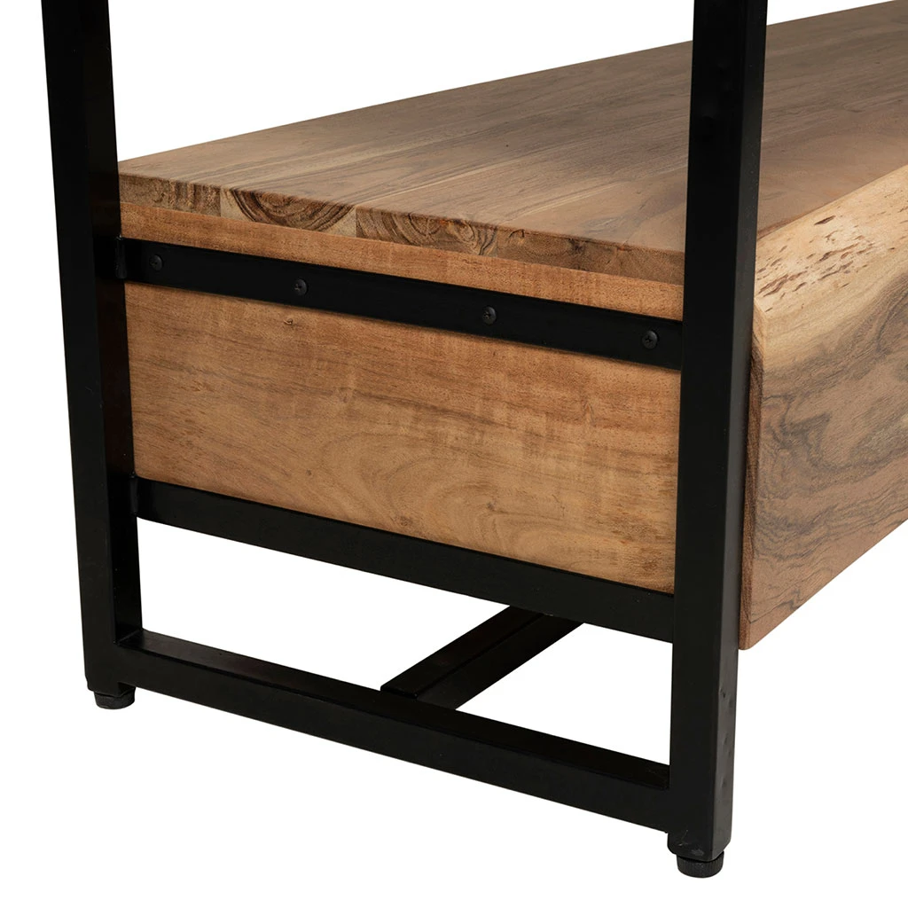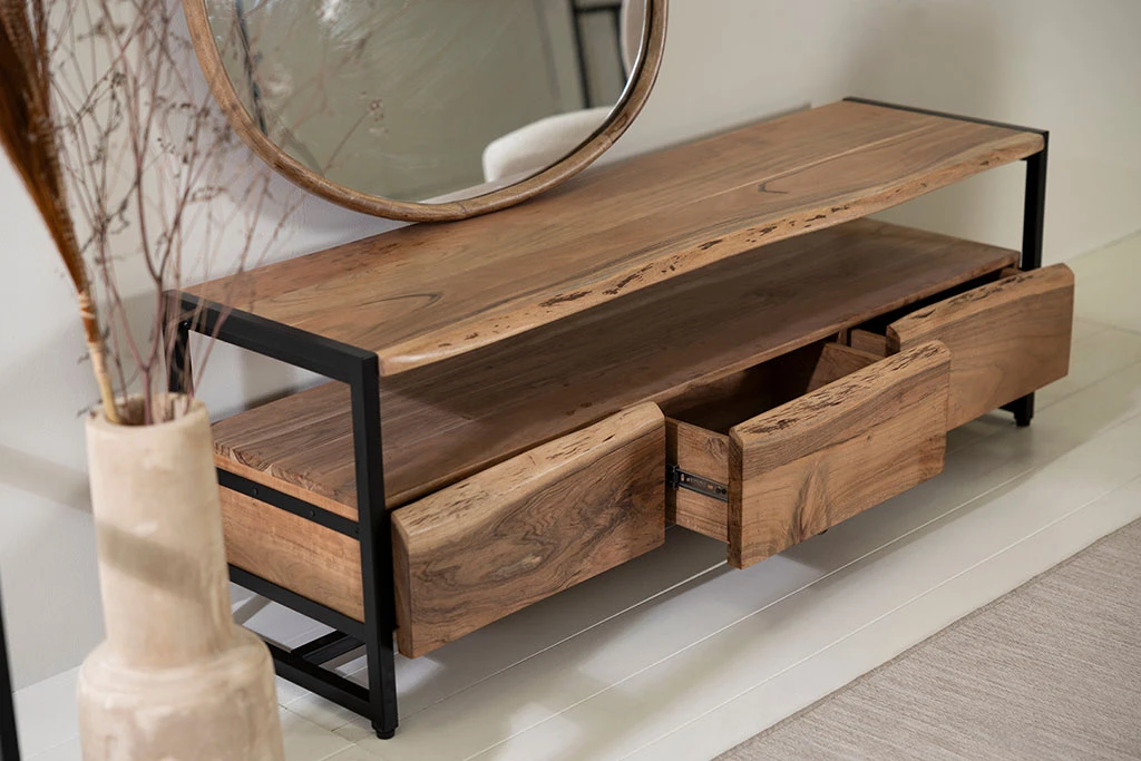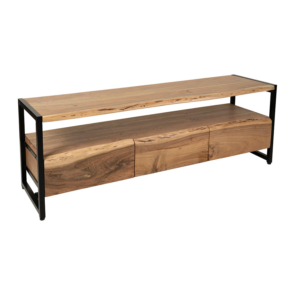 Ajoutez une touche de style à votre salon avec le Meuble TV 3 portes en acacia et pieds en fer noir – Brooklyn.