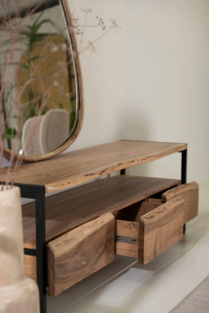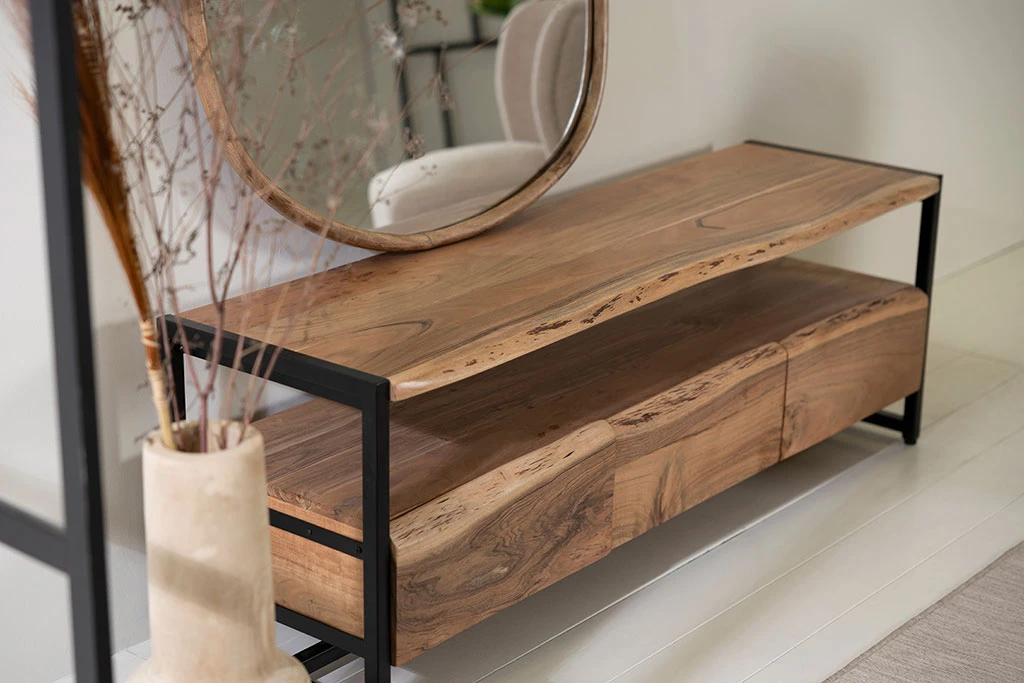 Fabriqué en acacia de haute qualité et doté de trois portes spacieuses, ce meuble offre amplement d’espace de rangement pour vos appareils multimédias, vos DVD et autres accessoires.