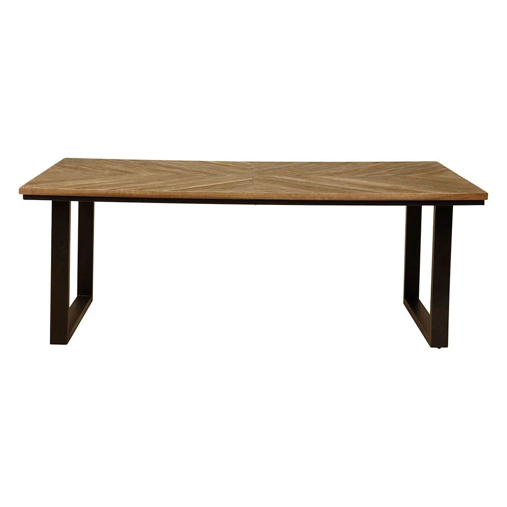 Avec son plateau en teck recyclé et ses pieds en métal noir, cette table repas arbore un look original.