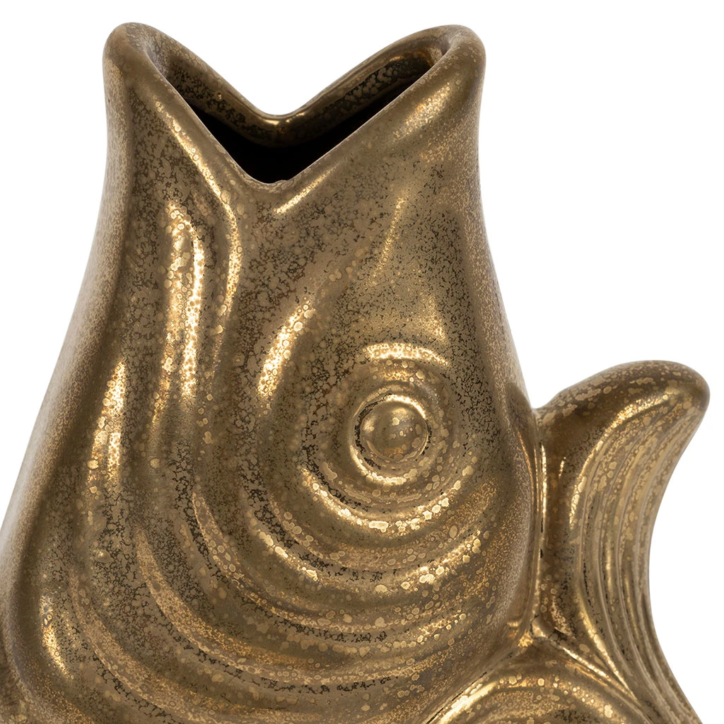 Faites briller votre intérieur avec ce vase en forme de poisson en grès doré, une pièce décorative audacieuse et pleine de charme.